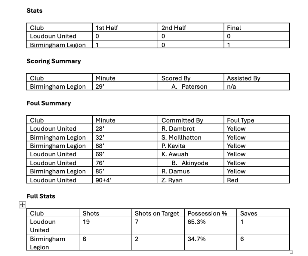 Leesburg, VA (October 4th, 2025) – Loudoun United Football Club falls to Birmingham Legion FC in a 1-0 loss at Segra Field.